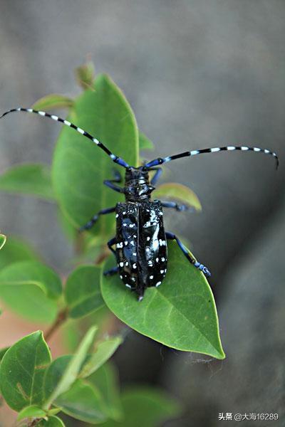 天牛是比较大的昆虫,最长有七八厘米,黑色甲壳上布满白星点。头顶有两根和身体一样长的触角,两个牙齿就像一把钳子。被它咬一口手指手就是两个窟窿直流血。