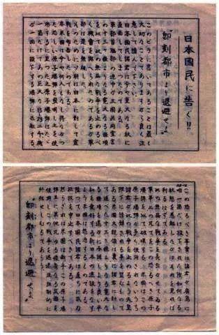 在那些内容中,他们有注明他们可能对其进行轰炸的几个日本城市,用来提醒日本人他们自己即将对日本人展开的轰炸。