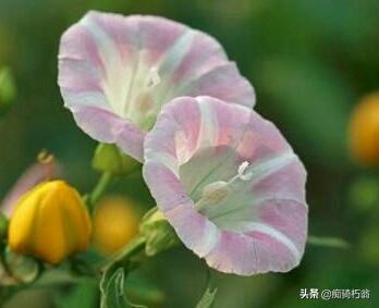 认识打碗花打碗花是农村田野常见的杂草之一,它的花是浅筒的喇叭状,粉色,花萼外有两个大苞片,像被打裂的碗儿。