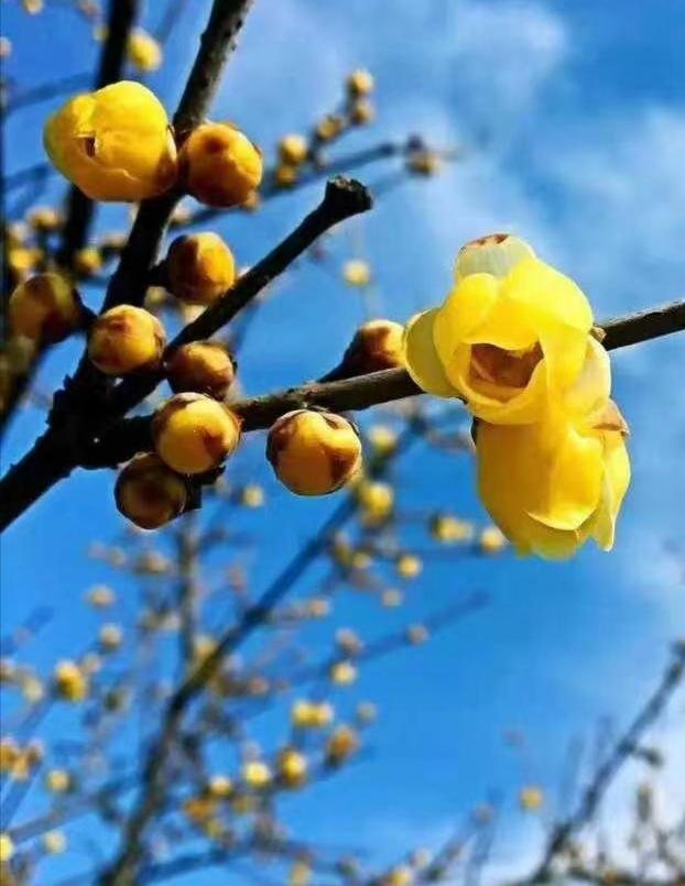 隆冬到来时,百花迹已绝,惟有蜡梅破,凌雪独自开。此时,鄢陵的蜡梅相继绽开。金黄剔透的蜡梅,吸引着无数游人冒着严寒前往观看。蜡梅因似梅花,与梅花开花期又相接近,所以很多人将蜡梅也当作梅花。蜡梅是中国特产的传统名贵观赏花木,称蜡梅为寒客。蜡梅花开春前,为百花之先,特别是虎蹄梅,农历十月即放花,故人称早梅。形态特征:腊梅为落叶或半常绿大灌木,最高可达4—5米,丛生性,其根颈块状发达,江南称为“蜡梅”。老枝近圆柱形,灰白色,粗糙,皮孔特别明显;嫩枝节部膨大,四棱形,表面光滑。叶为单叶,对生,卵形,全缘,表面绿色而粗糙,背面白色而光滑,长7—15cm。花多生长于去年生枝条下部,隆冬腊月陆续开放,有芳香。花被多数,内层较小,紫红色;中层较大,黄色稍有光泽,似蜡质,稍透明;内层基部紫色至全紫色,成对着生或叶芽生,有浓香;花朵最外层由细小鳞片组成,萼片与花瓣相似,不易区别;心皮离生着生在一中空的花托内,成熟时花托发育成朔果状,口部收缩,内含栗褐色小瘦果数粒,8月份成熟。