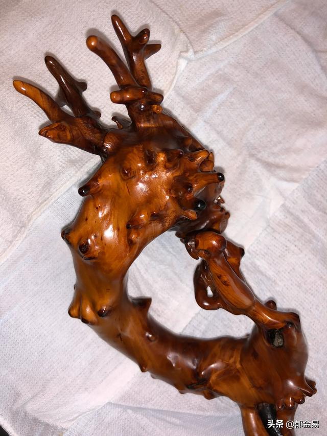 标题有误:应当是“根艺”而不是“根雕”。两者区别在于根艺以天然为主,尽量少动刀锯,属于老天爷的作品;根雕以人为雕刻为主,保存部分天然,属人类的作品。我收藏的根艺“反弹琵琶”,仅裁去上下多余部分,其余百分之百天然而成。