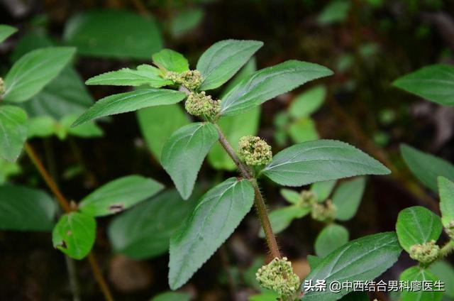 本品茎呈近圆柱形,长15~50cm,直径1~3mm。表面黄褐色或浅棕红色;质脆,易折断,断面中窒;地上部分被长粗毛。叶对生,皱缩,展平后叶片椭圆状卵形或略近菱形,长l~4cm,宽0.5~1.3cm;绿褐色,先端急尖或钝,基部偏斜,边缘有细锯齿,有3条较明显的叶脉。聚伞花序密集成头状,腋生。蒴果卵状三棱形,气微,味淡、微涩,全体有乳汁。夏季开淡绿色或紫色小花,杯状聚伞花序多数排成紧密的腋生头状花序。朔果卵状三棱形,被贴伏的短柔毛。