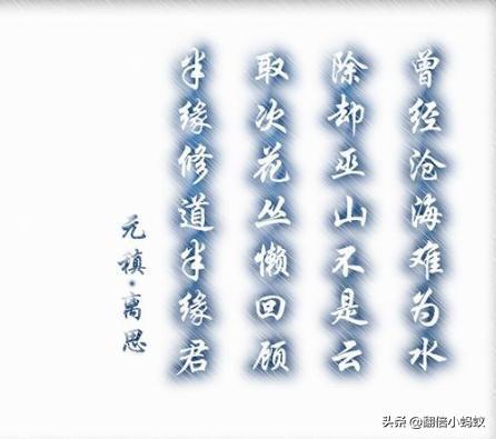 试问,谁读了这首诗能不流泪,不感伤,不被他感动,元稹将自己的亡妻比作沧海之水,巫山之云,自此之后,天下再难寻觅。