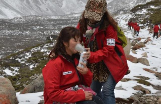 看到这里,其中一个有经验的旅游爱好者,直接拿着氧气瓶,赶紧跑上前去扶起老大爷,让他吸氧气。