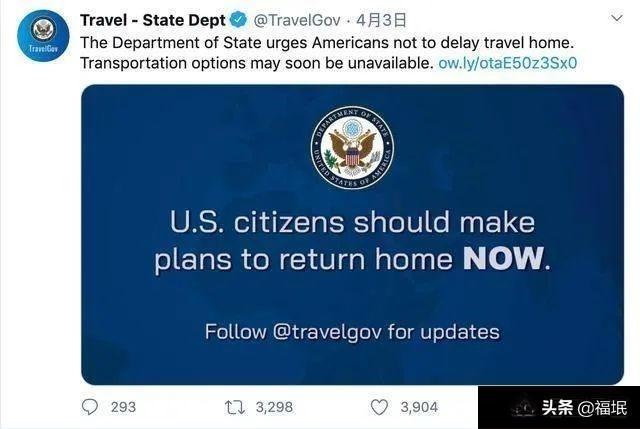 美国新冠肺炎疫情愈演愈烈,的目前确诊超过33万例,累计死亡逼近一万例,最近美国国务院领事事务局发布推文,呼吁在海外的美国人尽快回国。 “美国国务院敦促美国人不要延期回国。可能很快所有交通工具都无法使用。”这条推文写道。在这条推文下,美国务院领事事务局还附上一张图,图上写着“美国公民现在应该制定回国计划”的字样。图中的“『现在』”还特意用大写标粗。