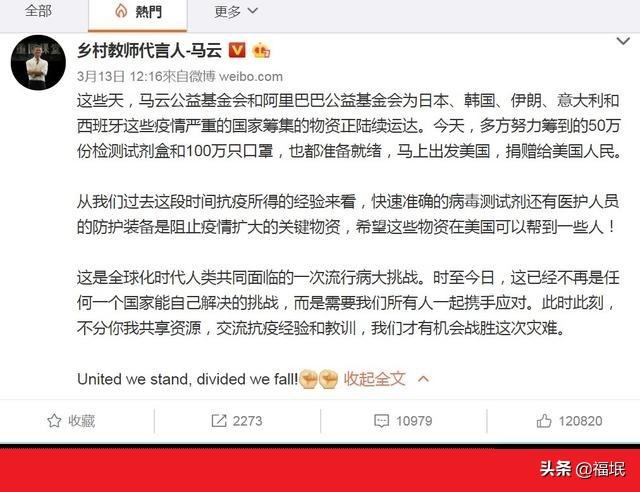 不过,就在3月13号的时候,就在美国承认疫情严重的第2天,马云公开发文称:“已经筹集到了50万份检测试剂和100万只口罩,准备发送到美国。”