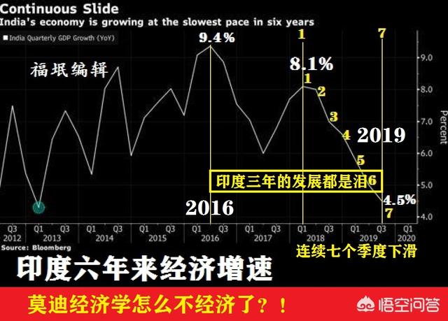 印度的季度增长率从9.4%降低到4.5%,再差0.1%就降了5个点,这个5点跑哪里去了,印度到底发生了什么?莫迪无力与议员睡觉。