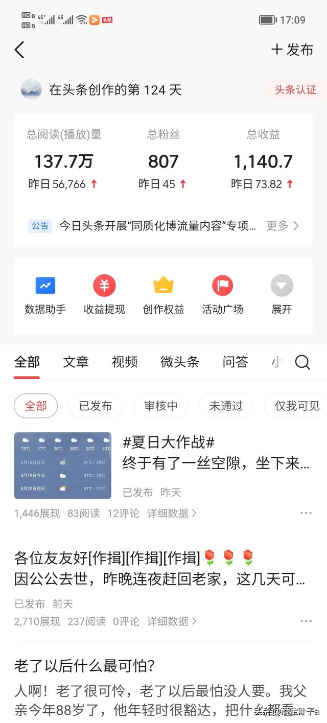我在头条创作89天,粉丝1696个,发文405篇,收益119元,平均每篇约0.29元,其中有的文是0收益,有的是1分两分,但时至今日,依旧乐此不疲在头条晃。
