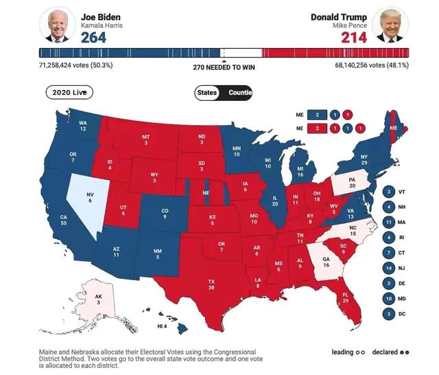 截止目前:计票出来的选举人票拜登238,特朗普213,谁先到270谁将成为美国总统。