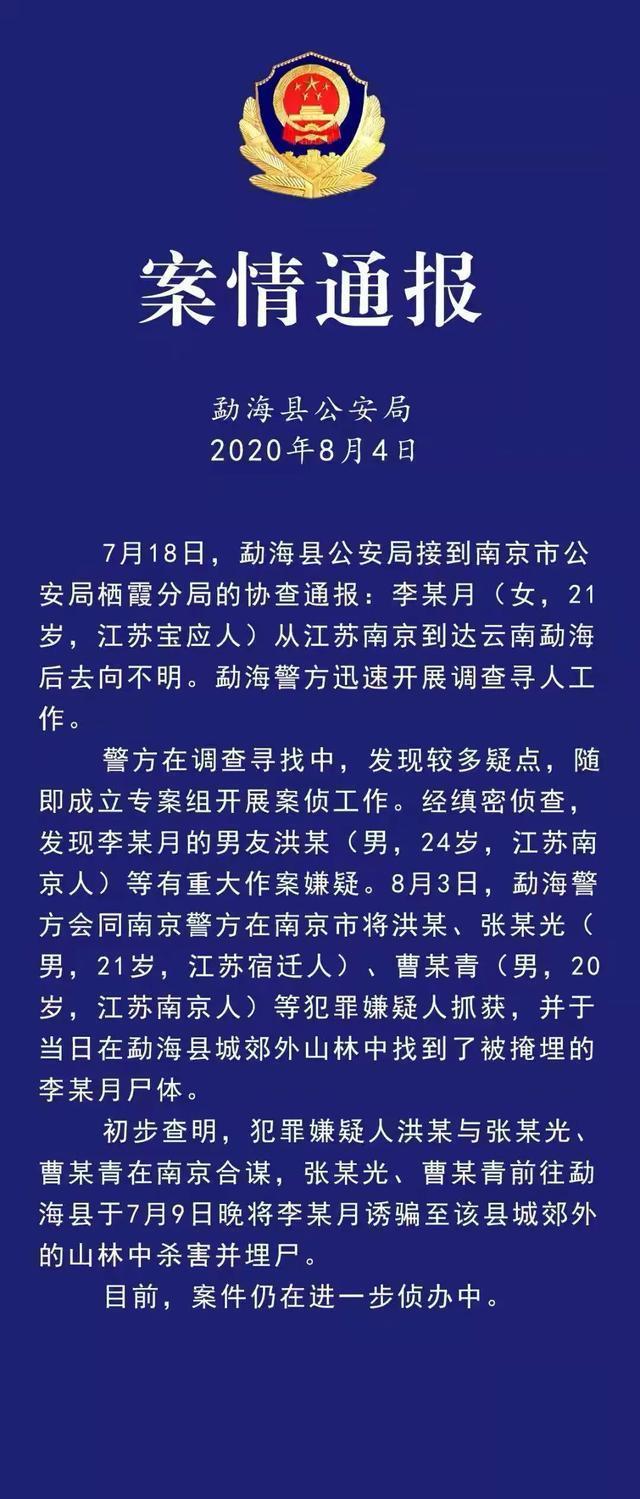 目前警方已经初步查明被害人的24男友洪某,伙同21岁的张某光、20岁的曹某青一起在7月9日晚上,把被害人21岁的李某月,诱骗至勐海县城郊外的山林中杀害并埋尸。