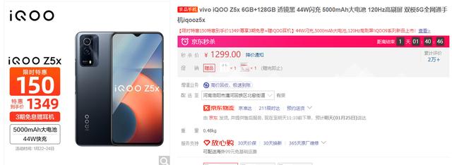 1、IQOO Z5X:6+128G 1299元 JD自营。