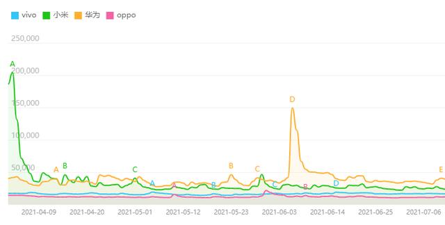 我们从网络关键词热度上就可见一斑,如下所示,这是某度关键词热度指标(黄色华为,绿色小米,蓝色VIVO,紫色OPPO),VIVO和OPPO在网络上的热度完全不敌华为和小米,根本就不是一个档次的。