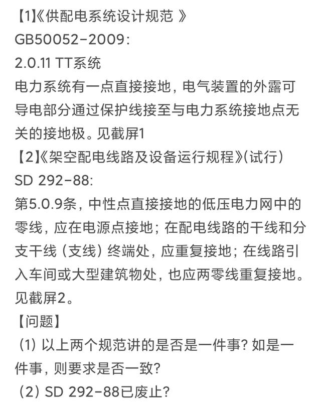 答:电力系统中的TT系统接地的两个规范要求是一样的。而供配电系统设计规范老国标GB5002-95是2009年十一月十一日废止的,同时执行的新国标GB50052-2009,仅仅只是在原有基础上,根据有关国际标准和国外先进标准增加了一下内容。