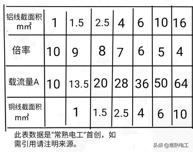 实际上对这些常用规格的导线应该用不同的倍率来算载流量,我总结出的方法是对1、1.5、2.5、4、6、10、16平方7种规格导线,分别用10、9、8、7、6、5、4这7种倍率来计算载流量