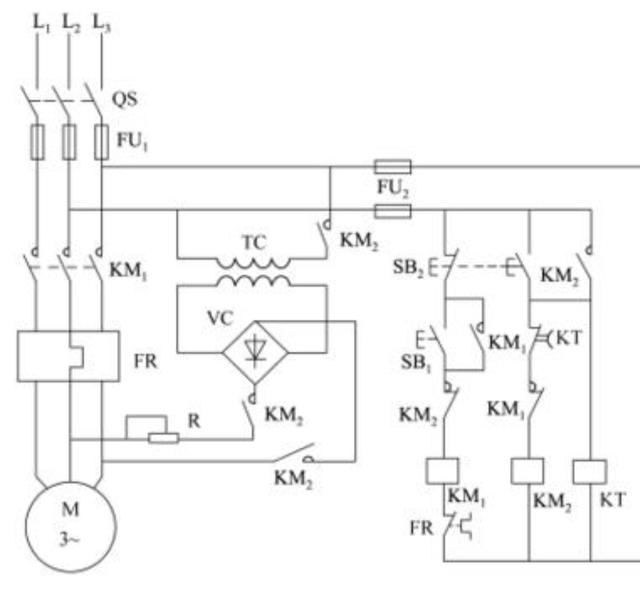 图中TC是变压器,VC是整流桥,把变压器低压侧输出的交流电整流成直流电,这个电路中的可变电阻R,是用于调节能耗制动电流大小的,制动电流大电动机从断开交流电到完全停止的时间就短,反之这个时间就长。但是,因制动电流较大,这个可变电组就要求功率较大,实际应用中采用大功率可变电阻不太现实,小功率电动机制动电流就达几安培,电阻要几十瓦,体积大发热严重,所以很少会在制动回路中采用电阻。