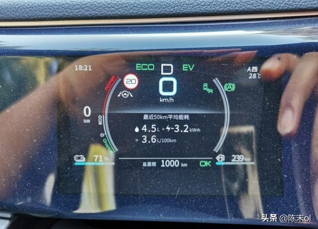 话不多说,直接上油耗表。这是纯保电状态下开出来的油耗,可以看到,电量这块是-3.2kw,也就是车辆低于70%的SCO设定值了,发动机用油发电,保证电池电量在70%以上,所以还给电池充了3.2度电进去。但是就算这种保电状态,油耗也不过4.5L,丰田双擎还要5L出头呢!如果不算发动机给电池充进去的那3.2度电,那么实际油耗还要少一点,只有3.5L的纯油耗。