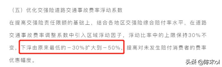 旧版的交强险险,其上下浮动的比例在±30%,新版的车险浮动上限没有变,但是浮动下限从-30%提高到了-50%。