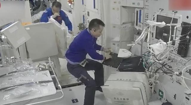 ▲航天员汤洪波在天和舱内使用ThinkPad。