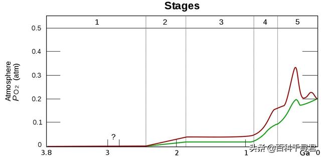 最早的氧气可能来自于光合细菌,也有可能来自于地球内部,由火山爆发而来。约35亿年前出现了最早的光合细菌(蓝藻),但并不意味着当时的大气中就有了氧气,因为有限的氧气会被快速的消耗掉。在地球形成的最初20多亿年里,大气一直处于缺氧状态,可能与熔岩冷却消耗有关。24亿年前地球发生了一次“大氧气事件(GOE)”,大气中的含氧量达到1-3%。这种低氧环境一直持续到6-7亿年前,“雪球地球”时期结束后,大气含氧量迅速提升,推测是因为大面积的浅海使得蓝藻爆发性生长,释放出大量氧气,大气含氧量从1-3%上升到10-12%。由于含氧量升高,促成了“埃迪卡拉纪生物群”和“寒武纪生命大爆发”的产生,地球开始变得热闹起来。到了距今约3亿年的石炭纪末二叠纪初,大气含氧量达到历史最高值,接近35%,整个石炭纪的平均大气含氧量约32.3%,所以石炭纪出现了很多巨型昆虫,比如翼展可达70厘米的巨脉蜻蜓和体长70厘米的普莫诺蝎。但氧浓度只对低等动物的体型有影响,因为它们的呼吸方式很特殊,而对高等动物没有影响。因为大气含氧量高,很容易引发森林大火,整个石炭纪基本都处于大火之中。