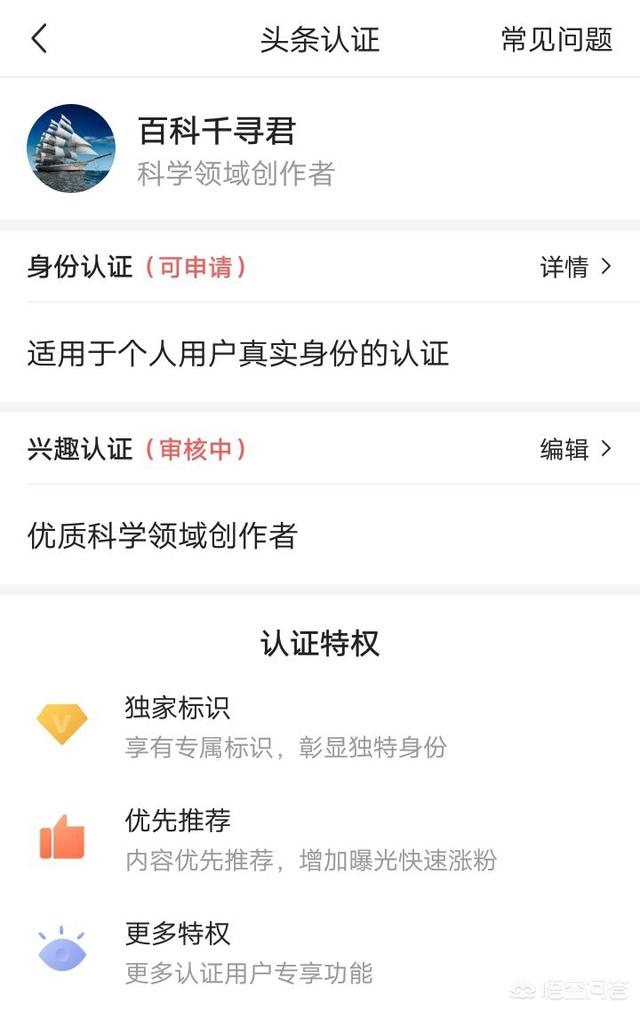 兴趣认证是某领域(普通/优质)创作者的认证,是垂直领域内创作能力最好的体现。普通创作者比较简单,30天内4个优质回答,类似于命题作文或论述题。大多数申请者在期限内完成,有些人能在一天内完成。最难得是从普通创作者升级为优质创作者,需要在多方面展示自己的优秀创作力,回答、图文、视频或微头条和微视频,当然也有人通过其中突出的一方面升级优质创作者的。我的这个账号是通过优质回答升级的(获得过多次青云计划问答类奖励),另一账号是通过优质图文升级的(获得过多次青云计划图文类奖励)。总之,优质创作者(加黄V)体现的是优秀的某一方面或多方面的创作力,含金量是比较高的。