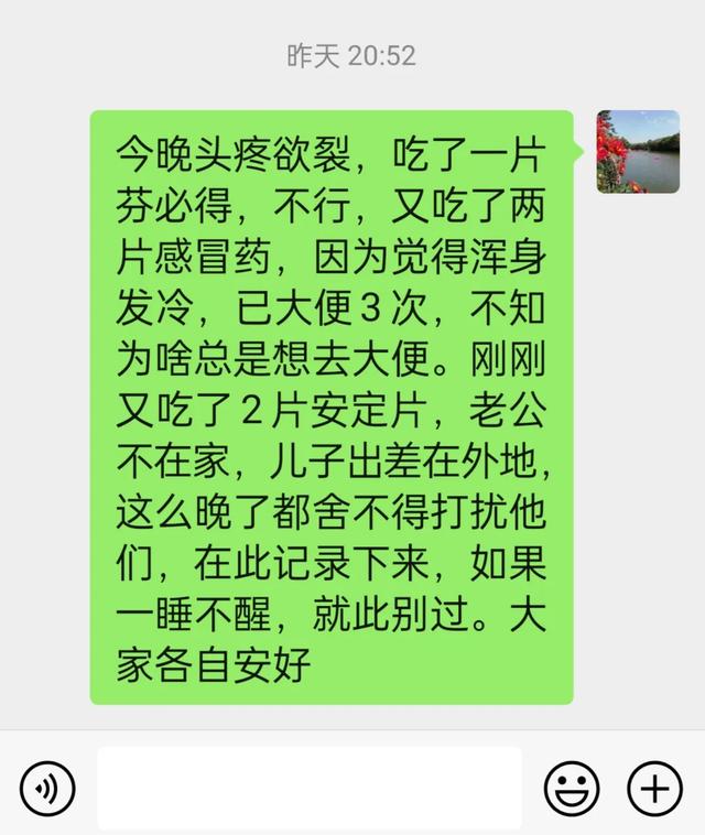 于是我忍着剧痛,写下了遗言,就是告诉我在外地出差的儿子和去参加同学会的老公,我整个晚上发生了什么,我没有任何感觉,特别平静,并且当时疼的我恨不能立即离开。所以,我写过遗言,并毫无感觉。