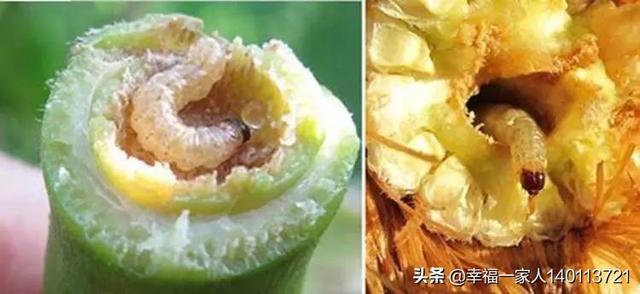 玉米雌穗抽出来后,幼虫就开始转移危害,兵分两路,一路就会取食花丝和嫩苞叶,蛀入穗轴取食幼嫩的籽粒,另一路就由茎秆和叶鞘间蛀入玉米的茎秆,啃咬内部瓤,茎节间组织受害,发脆,一旦遇到风雨,就会从其折断,就会造成籽粒不饱满,青枯早衰,被其严重危害的玉米穗甚至颗粒不收,造成严重减产。