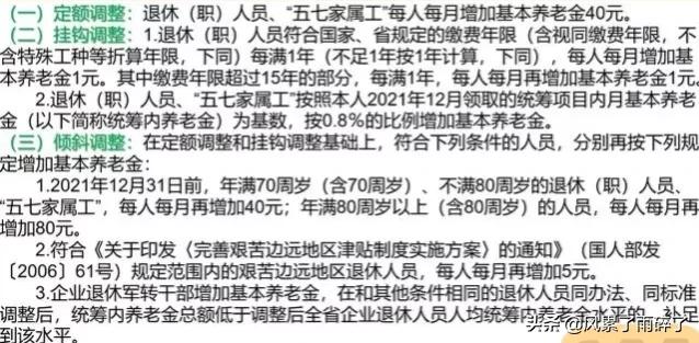1、对高龄退休人员的倾斜调整。到2021年12月31日前,年满70周岁不满80周岁的退休人员,每人每月倾斜增加40元;年满80周岁以上的退休人员,每人每月倾斜增加80元。