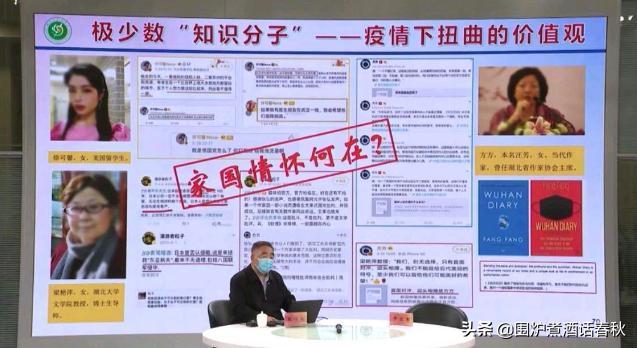 5月12日,张伯礼院士在天津利用网络直播的方式,为天津广大大中学师生上了一堂生动的抗疫思政课。比较有意思的是,张伯礼院士在这堂课中贴出了一张图,他以方方、张艳萍和许可馨等人作为负面教材,批评她们为“极少数知识分子”,说她们价值观严重扭曲,并对此提出反问:家国情怀何在?
