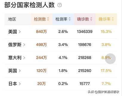 美国疫情不但严重,而且还远远未到达拐点,因为现在美国只进行了840万次检测,就已经确诊了134万人,确诊率高达15.3%,这只比不执行隔离措施的英国少,英国的确诊率为17.5%,比世界其他国家的确诊率都高得多!就比如说俄罗斯斯最近新增确诊多,但它的确诊率也只有3.8%,意大利也只有8.9%而已!