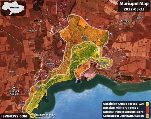 截止3月24日,俄军已经扫清了马里乌波尔的外围区域,并且夺取了马里乌波尔左岸(河东区域)、机场、亚速钢铁厂及工业区等重要区域,巷战已经开始在马里乌波尔各条街道打响,据俄罗斯媒体的说法,马里乌波尔市区70%的区域已经被俄军控制。而两天前,俄军控制的区域是50%。