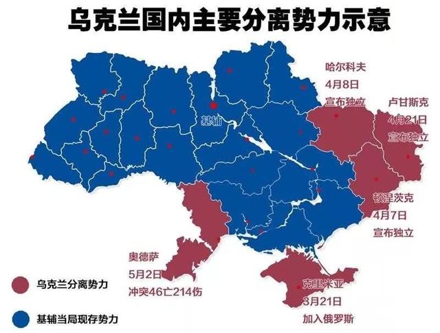 图为乌克兰局势示意图,其境内很多地方都属于亲俄区域,一旦乌克兰对俄罗斯宣战,自己内部就先分裂了。