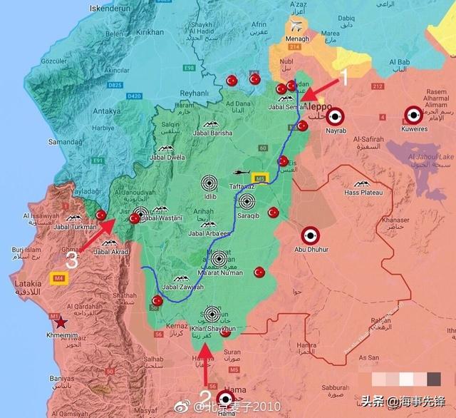 图为伊德利卜战役开始前的局势,目前,红圈内的马特埃雷·努曼和萨拉齐布已经被叙利亚政府军收复,下一步,叙利亚政府军的打击重点变成了蓝圈内的伊德利卜市和舒古尔市。