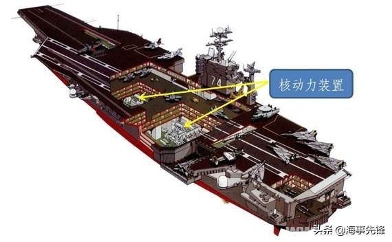 图为核动力航母核反应堆的位置,及动力装置占据空间的大概情况。