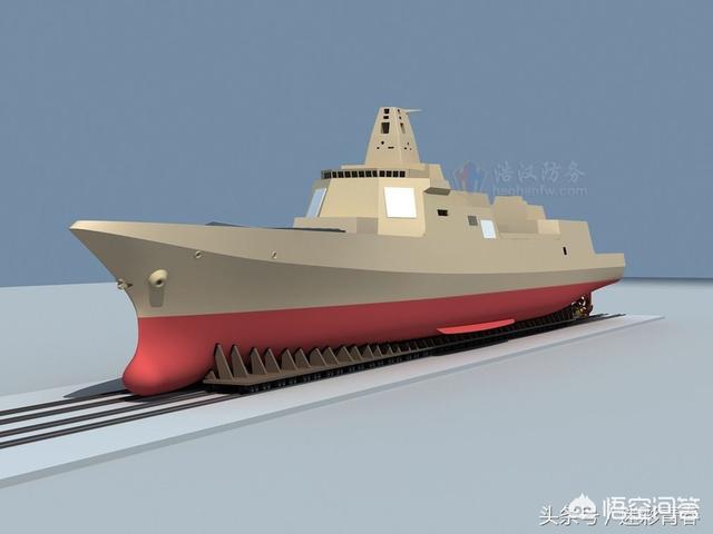 图为055型驱逐舰在造船厂建造时的模拟图。