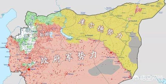 图为当前的叙利亚形势图,红色部分为政府军控制范围,黄色部分是库尔德区,而绿色部分是伊德利卜区域。