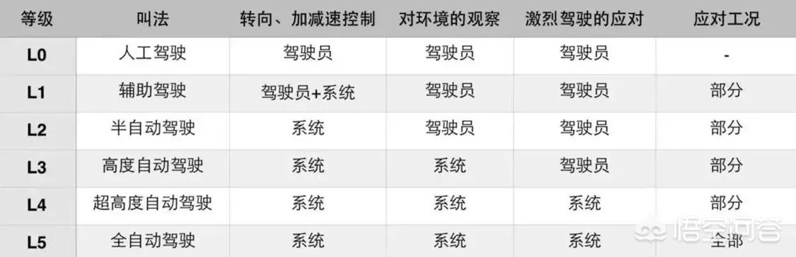 无人驾驶的五个阶段说到无人驾驶,很多人都会提起五个发展阶段。虽然这不是今天我想要聊的重点,但是还是有必要花点篇幅来说明一下。