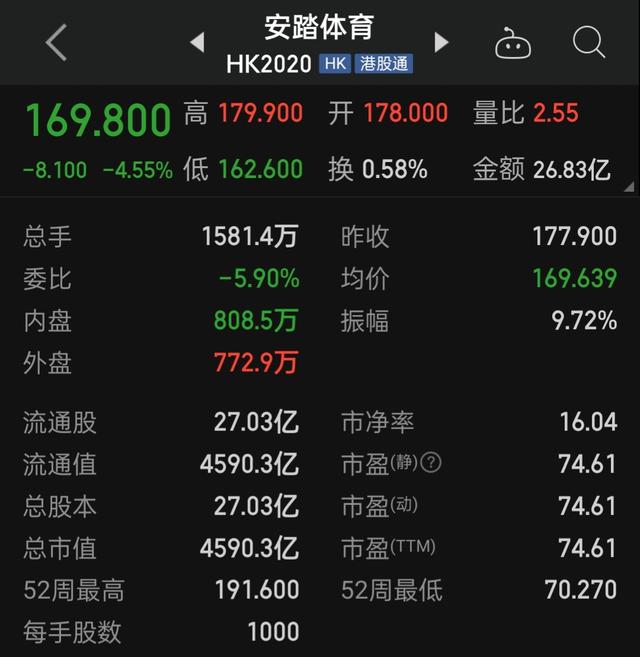 目前国内体育市场第一安踏市值4590亿,第二李宁市2090亿值这点毋庸置疑。第三名个人认为是滔博或者特步。