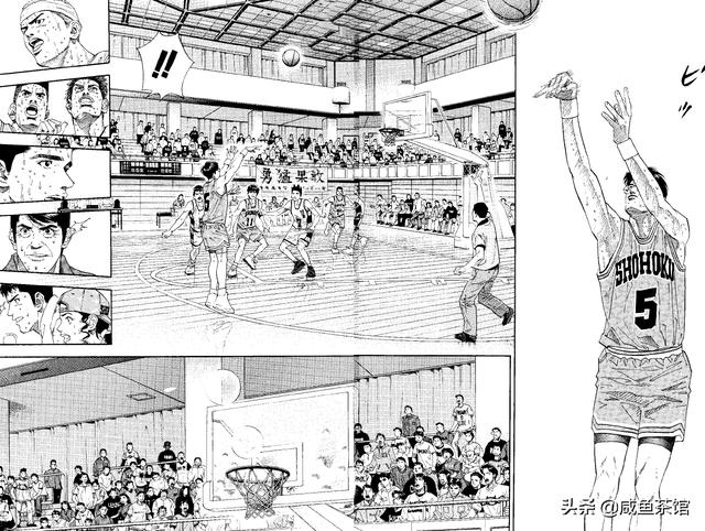但这一球最大的功臣,应该是连续拦截福田吉兆、抢断仙道彰、大帽鱼住纯,彻底撕裂陵南防御的樱木花道。如果没有樱木神鬼一般的BT防守,专注外线防守的池上亮二不可能失位,木暮也不可能有那么大一个空位,这个超长的回忆三分也就无从谈起。