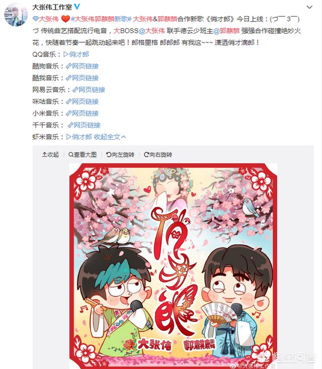 德云少班主郭麒麟跟人间精品大张伟合作的单曲《俏才郎》正式上线了。