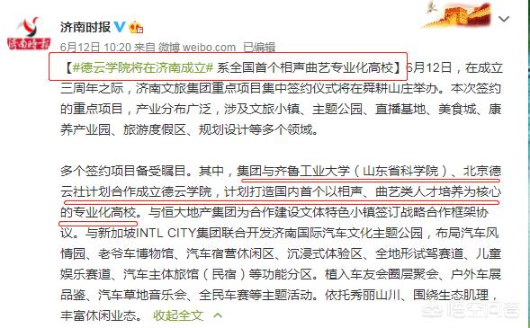 近日,济南时报官宣“德云学院将在济南成立”,该项目是三方共同参与,包括德云社、齐鲁工业大学、济南文旅集团。主导方式济南文旅集团,而这个德云学院也是“德云文化广场”衍生的子项目之一,具体如何实施各方还在协商对接中。