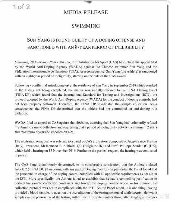 北京时间2月28日下午5点,一个令中国体育迷心碎的消息传来。国际体育仲裁法庭公布了“世界反兴奋剂机构(WADA)诉孙杨和国际泳联案听证会”的裁决书,孙杨被禁赛8年,即日起生效。