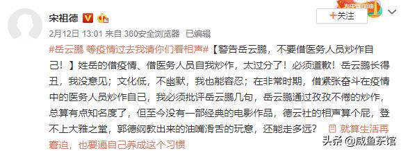 宋祖德怼岳云鹏借助疫情和医护人员炒作,其实是吃不到葡萄说葡萄酸的嫉妒表现。