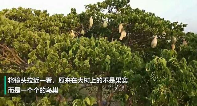 原来这棵大树上的鸟窝,是一种叫做织布鸟的鸟类搭建出来的。织布鸟长相有点像麻雀,但要比麻雀有着超长的搭窝能力,它所建造出来的鸟窝造型独特,与其它鸟筑巢方式不同的是,织布鸟在搭建巢穴初期是口朝下的。