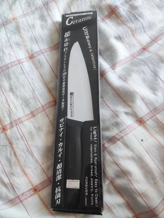 这就是我的陶瓷刀,这是在09年到日本旅游时老伴买的,当时还买了一把陶瓷剪刀,不过,剪刀在前几年不小心掉地上摔断了,当时我还好一阵心疼。
