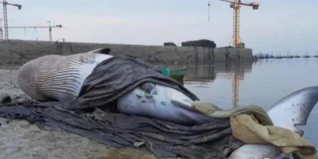 2022年3月18日,辽宁大连长海县小长山岛海域一位渔民发现了一头体长5米的小须鲸,在发现时,小须鲸已经死亡发臭,之后,渔民将其用船拖上来岸。根据现场报道的视频看,这头小须鲸已经严重胀气,尤其是嘴巴已经完全鼓起。(下图为现场的图片)