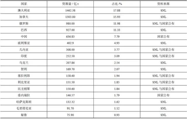 铁矿是世界上分布最为广泛的金属矿藏之一,全球七大洲都有分布,根据公开的资料显示,全球铁矿资源量达到8100多亿吨,这些铁矿在全球的分布非常不均衡,资源量排在首位的是澳大利亚,接近1500多亿吨,占比超过五分之一,另外,加拿大、俄罗斯、巴西、中国等国的铁矿资源量紧随其后。据统计,铁矿资源量排位前十位的国家,总量占比超过80%,很多国家和地区则相对贫乏。另外,占据地球总面积超过70%的海洋底部,也蕴藏着大量铁矿石资源(以铁锰结核为主),总量达到3万亿吨以上。