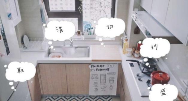 厨房的基本动线是洗菜(水槽)→切菜(台面)→炒菜(炉灶)按顺序进行,可以顺时针,也可以逆时针。