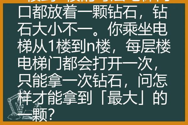 1楼到n楼的每层电梯门口都放着一颗钻石,钻石大小不一。你乘坐电梯从1楼到n楼,每层楼电梯门都会打开一次,只能拿一次钻石,问怎样才能拿到「最大」的一颗?