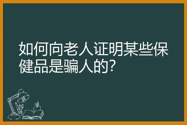保健品不等于原生补品,更不是药品,但有些老人被洗脑后总信以为真,子女劝导不进,反生埋怨,使子女好生为难。那么,如何向老人证明某些保健品是骗人的呢?一是用小恩小惠诱导的。那些卖假保健品的人给老人培训后,送鸡蛋等物品,免费旅游的。二是过度夸张某一保健品的作用,说得天花乱坠,变成保医百病的。三是有一人推销,“旁人"助张的。四是请专业懂医的人剖析保健品的组成成分。五是用实例揭穿某一保健品的伪作用而致人身体损害的。六是劝导天下没有长生不老的保健品,皇帝的宫廷秘方保健品都没能使皇帝长生不老。七是揭露某些骗取老人钱财的案例,警醒老人。八是从正面肯定原生补品的一定作用。老人真正想保健身体的,买些原生补品,因人因季而适当补补,这才有一定的作用。而过度地不从自己身体实际出发的补,反而要补出问题,甚至伤害性命。