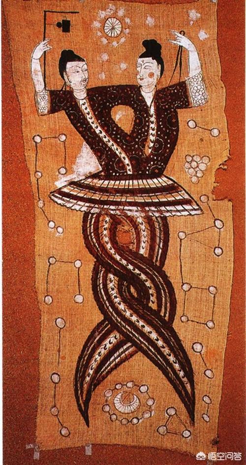 在远古时代,人们对于女人怀孕很好奇,把这一现象与自然现象或者动植物相联系起来。比如,炎帝神农氏的母亲,受孕时有神龙附体之感。黄帝轩辕氏的母亲因看到雷电环绕北斗,于是怀孕了。那么必然有某部落的女人在接触到蛇时怀孕了,恰好蛇是本部落的图腾,那生出来的孩子在他们的眼中必然是有神性的。于是人首蛇身的画像问世,人们把对蛇的崇拜在原始艺术上进行了加工。在考古界的发掘中,伏羲女娲画像尾交首上,像极了人类的DNA图谱。女娲作为一个天神,她的祖先就是原始画像了。在《山海经》里出现了诸多人面蛇身的大神,各自聚集成国,既长寿,又有各种超能力,代代相传,这都是原始艺术的遗传。